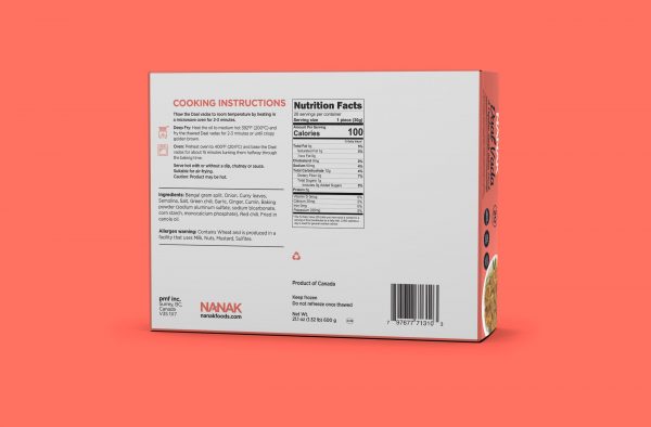 Bengal gram split, onion, curry leaves, semolina, salt, green chili, garlic, ginger, cumin, baking powder (sodium acid pyrophosphate, sodium bicarbonate, corn starch, monocalcium phosphate,red chili, fried in canola oil