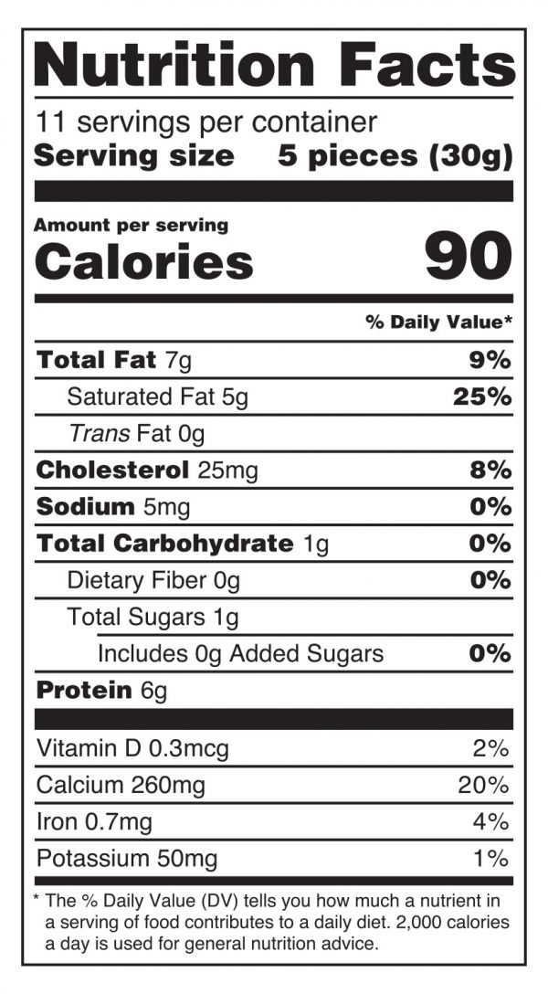 Serving Size- 25g Calories 90 Total Fat (g) 4 Saturated Fat (g) 3 Trans Fats (g) 0 Cholestrol (mg) 10 Sodium (mg) 130 Carbohydrate (g) 8 Dietary Fiber (g) 1 Sugar (g) 2 Protein (g) 5 Vitamin A 15% Vitamin C 0% Calcium 15% Iron 0%