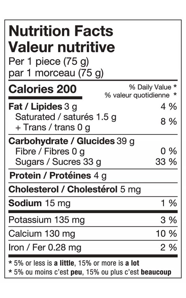 Serving Size- 80g Calories 200 Total Fat (g) 3 Saturated Fat (g) 1.5 Trans Fats (g) 0 Cholestrol (mg) 5 Sodium (mg) 15 Carbohydrate (g) 39 Dietary Fibre (g) 0 Sugar (g) 33 Protein (g) 4 Vitamin A 6% Vitamin C 0% Calcium 10% Iron 2%