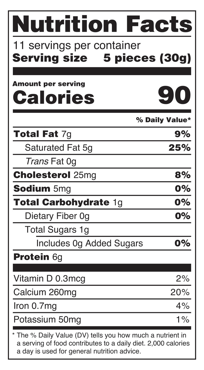 Serving Size per 5 pieces- 30g: Calories 90, Total Fat (g) 7, Saturated Fat (g) 5, Trans Fat (g) 0, Cholesterol (mg) 25, Sodium (mg) 5, Carbohydrate (g) 1, Dietary Fiber (g) 0, Sugars (g) 1, Protein (g) 6, Vitamin A 8%, Vitamin C 0%, Calcium 20% Iron 4%.